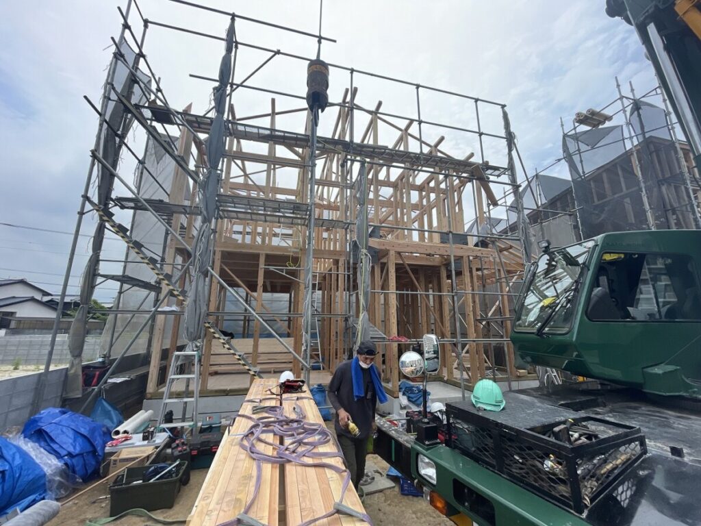 建物の写真も上棟途中ですが、迫力のある建て構えでお施主様も感動しておりました。